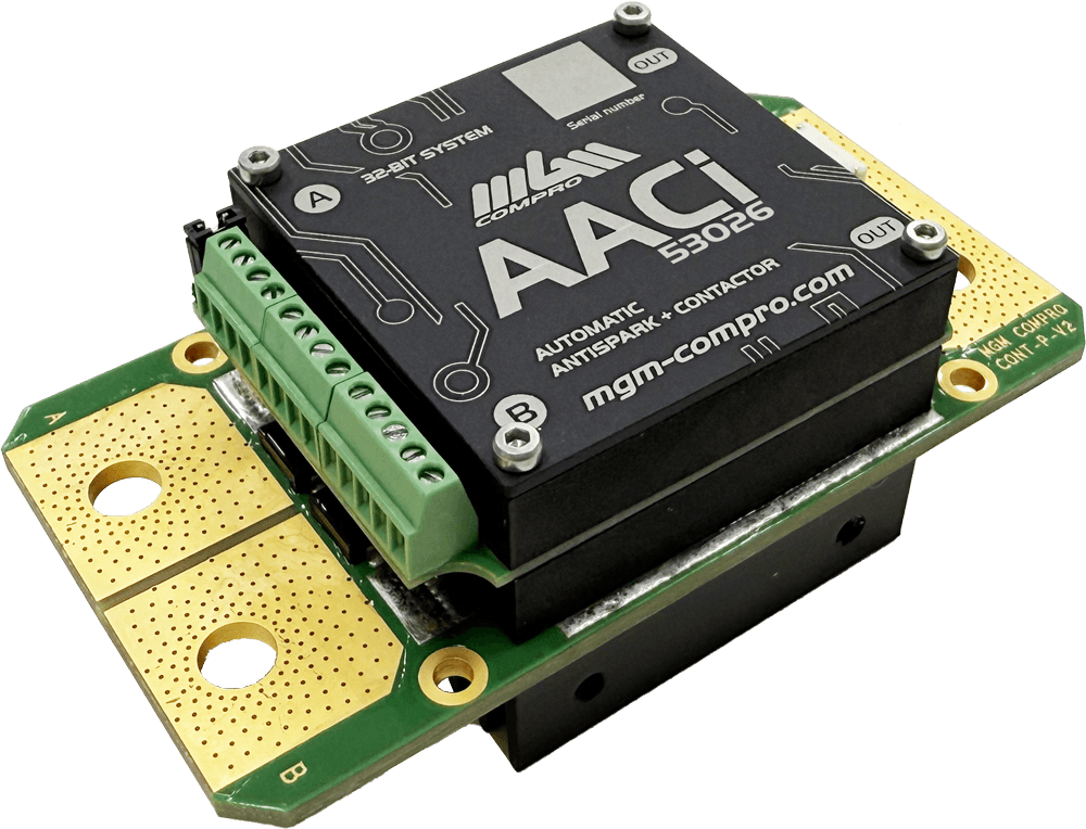 AACi modules are designed exclusively for the power connection/disconnection of loads (e.g. controllers and battery systems) in DC circuits. They are a very advantageous substitute for conventional mechanical contactors as they are significantly lighter and smaller. They require considerably less power control energy. Semiconductor contactors are equipped with a built-in antispark circuit that prevents sparking of contacts/connectors when connecting capacitive loads to power supplies (e.g. blocks of DC bus capacitors used in electronic speed controllers / inverters). This unique feature simplifies overal circuits and reduces their size and complexity. Our semiconductor contactors can operate with one-way or bidirectional operational conditions, depending on the chosen connection diagram. They also offer several modes of operation and uses, ranging from fully automatic to fully controlled by an external controller.